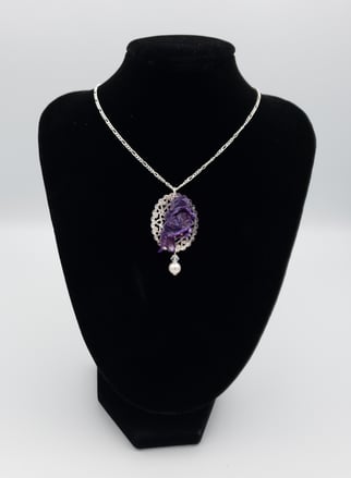 REAL Dark Purple Wolfsbane Sterling Silver Filigree Pendant w/ Swarovski Crystal Pearl Accent