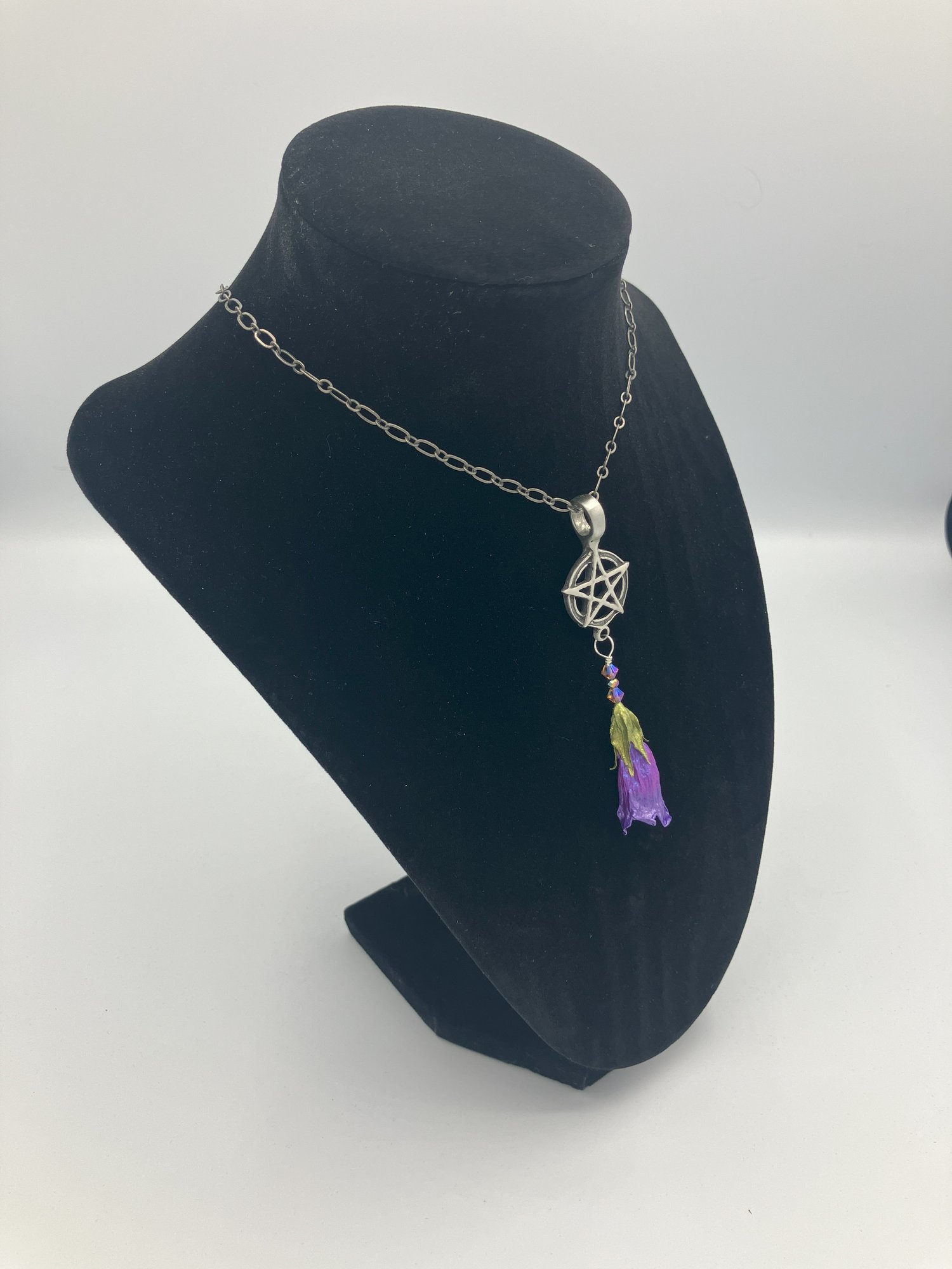 The only metallic elements in this piece are the wire bail, pewter pentacle, and the chain. The petals and the sepal leaves have been meticulously preserved, painted, and sealed, so everything you are seeing is the wicked flower itself. This process also ensures that the flower is safe to wear and handle. Since no two flowers are exactly identical there will be slight differences between the flower you receive and the flower pictured.