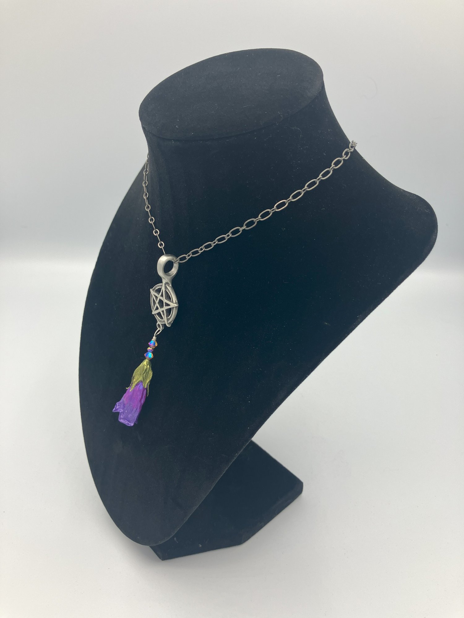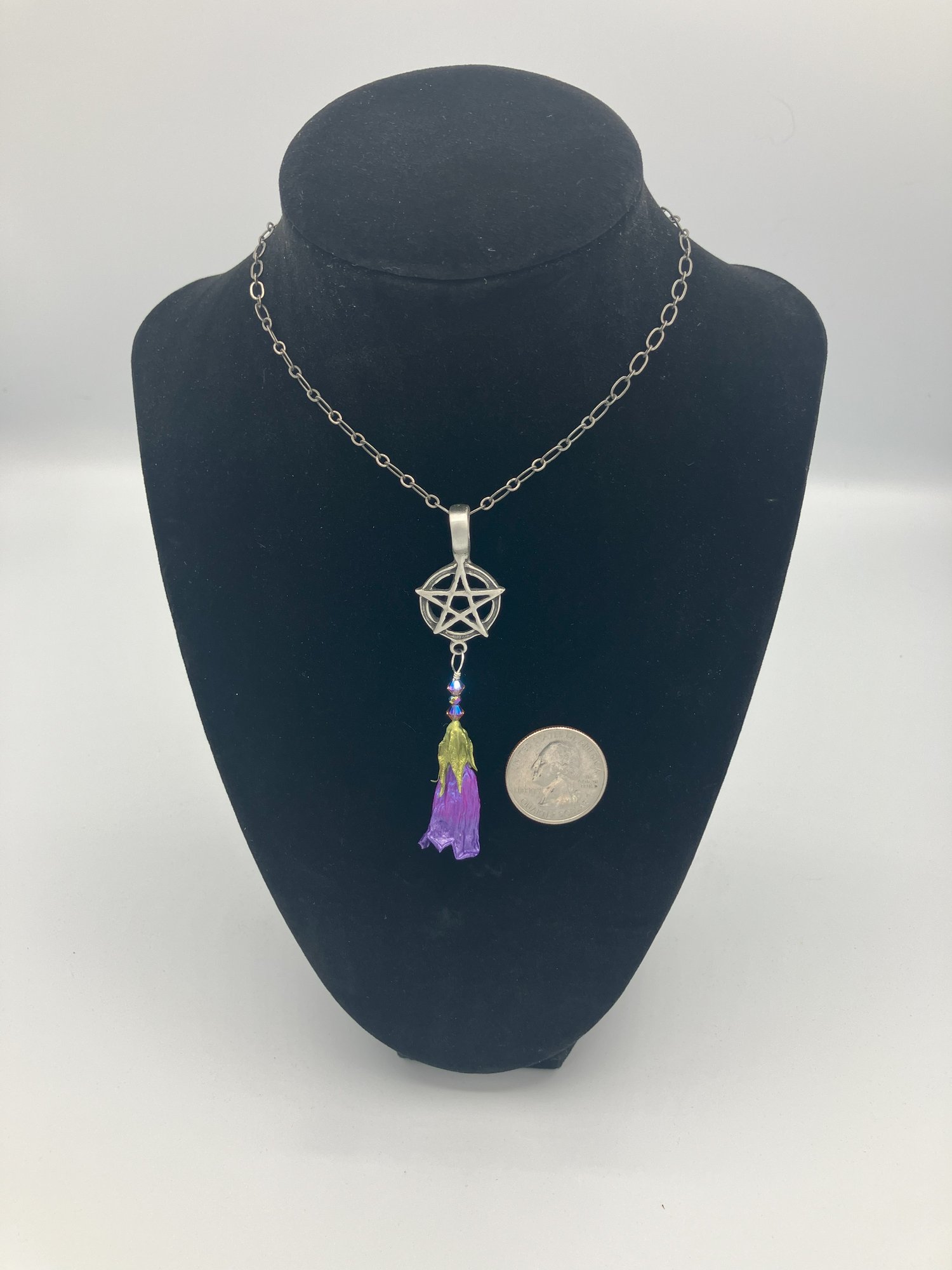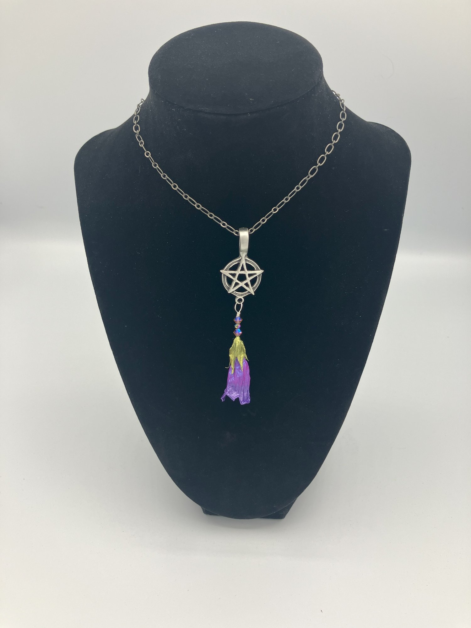 This pendant features a single REAL preserved deadly nightshade flower painted a brilliant electric purple shade on an antiqued pewter pentacle. This pendant comes on an 18 inch pewter-tone cable link chain.