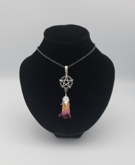 This pendant features a single REAL preserved deadly nightshade flower realistically painted a light purple shade on an antiqued pewter pentacle. This pendant comes on an 18 inch pewter-tone cable link chain.